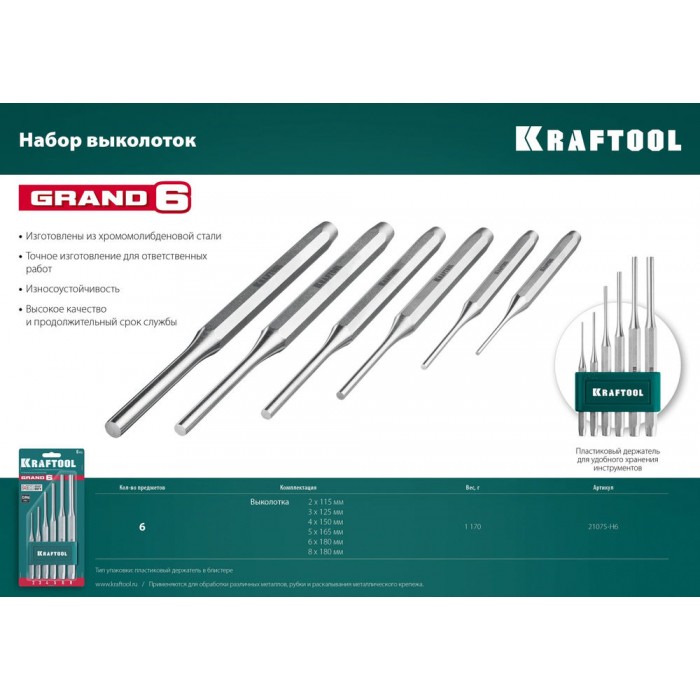 Преимущества Изготовлены из хромомолибденовой стали Точное изготовление для ответственных работ Износоустойчивость Высокое качество и продолжительный срок службы Пластиковый держатель для удобного хранения инструментов Использование Для выколачивания крепежных элементов из различных деталей