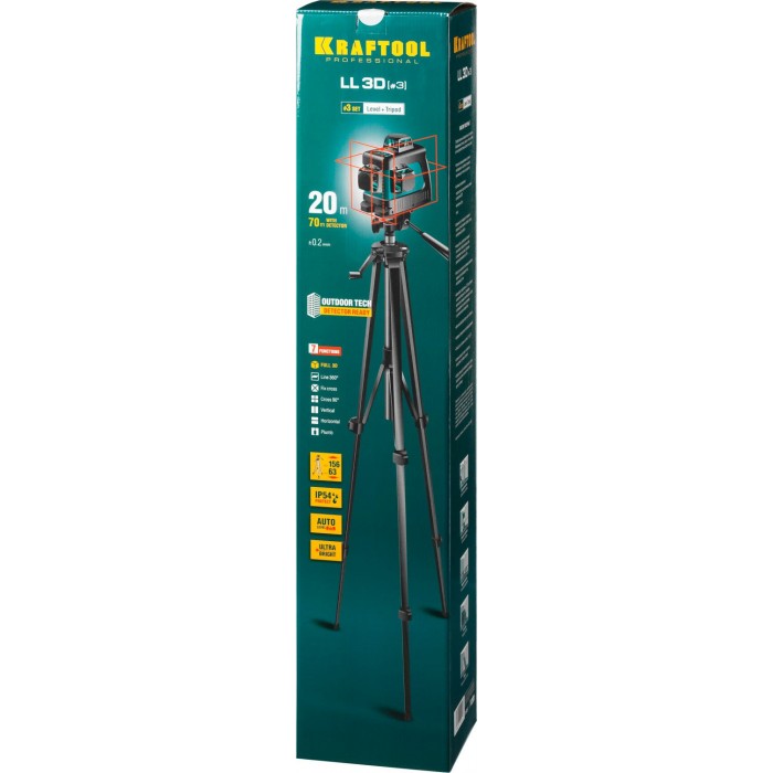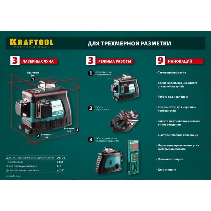 - 3 режима проецирования линий: горизонтальная и две вертикальные линии с развёрткой 360°, благодаря чему луч будет виден в любой точке.