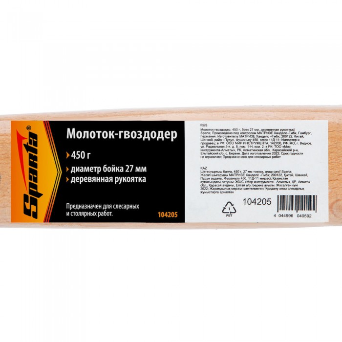 Молоток-гвоздодер, 450 г, боек 27 мм, деревянная рукоятка Sparta