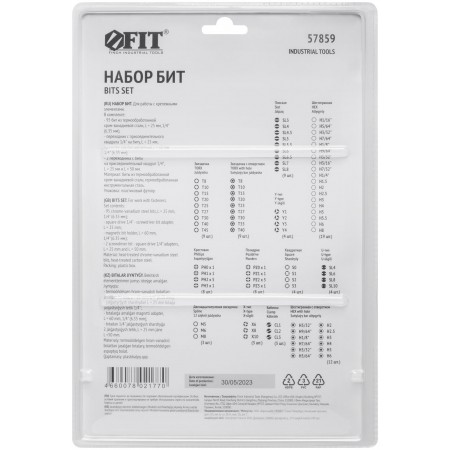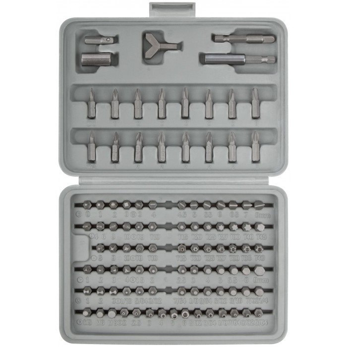 В чемоданчике. В наборе: 95 бит (L=25 мм); маг-нитный адаптер 1/4''; магнитный адаптер 60 мм; адаптер Y-типа для шуруп-кольца; 2 адаптера 25 мм – 50 мм. Биты: PH - 8 шт.; PZ - 8 шт.; S - 4 шт.; SL - 4 шт.; M - 3Eшт.; SL - 9 шт.; X - 3 шт.; Y - 4 шт.; CL - 3 шт.; T - 9 шт.; H - 19 шт.; с отверстием: T - 9 шт.; H - 12 шт. Материал: биты из хром-ванадиевой стали. Упаковка: пластиковая коробка вEблистере.
