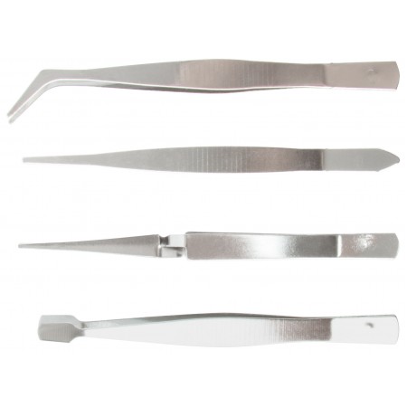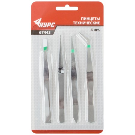 Набор. ''Пинцет прямой''. *Пинцет с захватом под углом 45 град . *Пинцет с изогнутым широким захватом. * Пинцет обратного действия. Материал: инструментальная сталь. Упаковка: блистер .