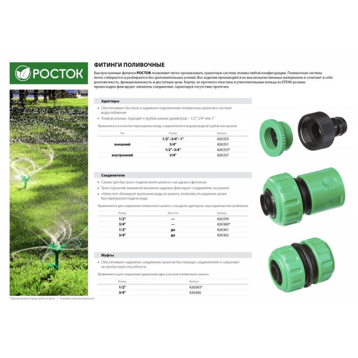 Аксессуары РОСТОК для поливочных систем надёжны и долговечны, изготовлены из ударопрочного пластика. Обеспечивают быстрое и простое соединение элементов.