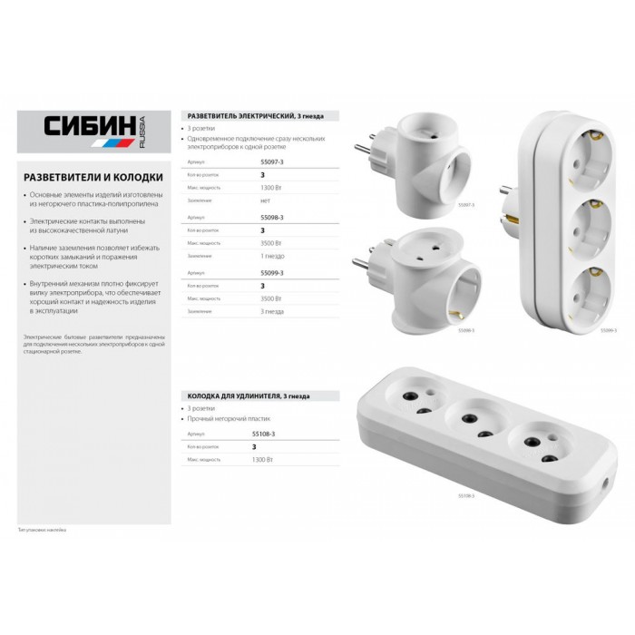Сетевой разветвитель 3 гнезда СИБИН 55099-3
