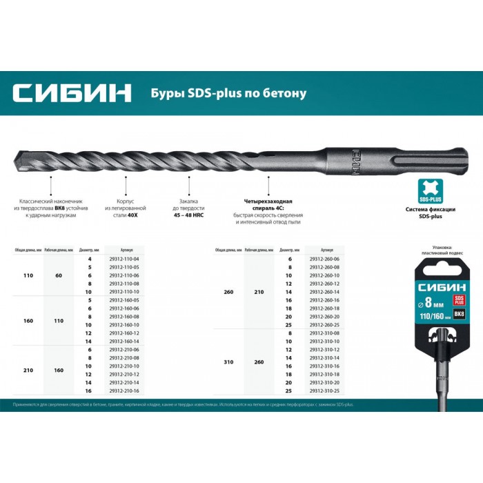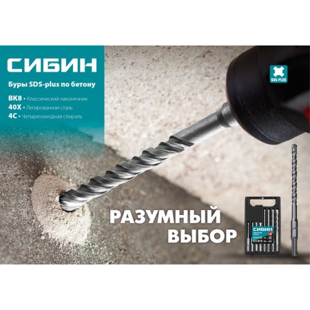 Буры СИБИН по бетону это надежный и проверенный инструмент в быту и строительстве, рассчитанный на использование на средних и тяжелых перфораторах ударного действия с зажимом SDS-plus.