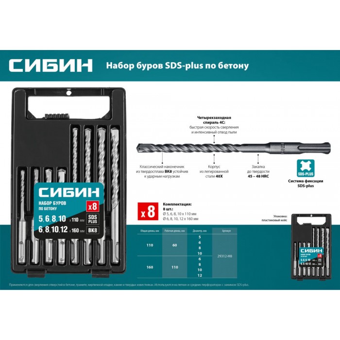Буры СИБИН по бетону это надежный и проверенный инструмент в быту и строительстве, рассчитанный на использование на средних и тяжелых перфораторах ударного действия с зажимом SDS-plus.