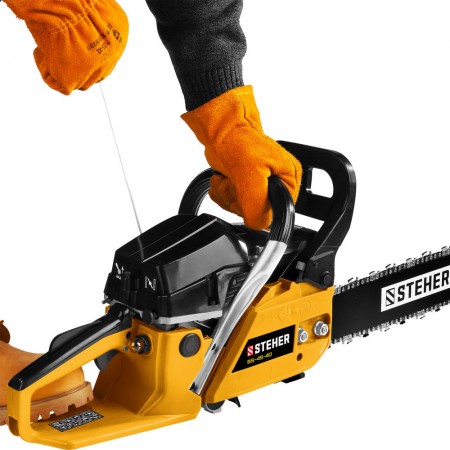 - Тормоз мгновенного действия обеспечивает высокую безопасность работ, мгновенно останавливая пильную цепь в случае опасности