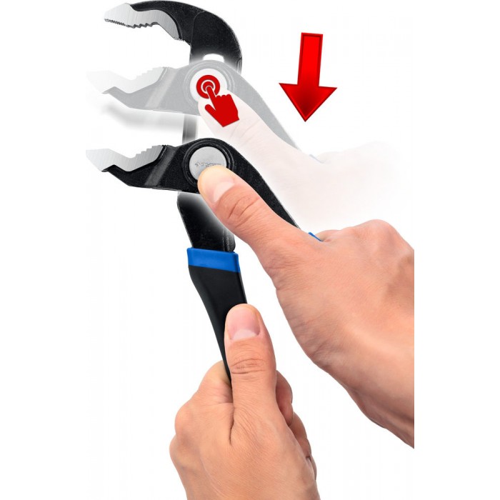Уникальная конструкция шарнира с кнопочным фиксатором обеспечивает быстрый подбор ширины зева.