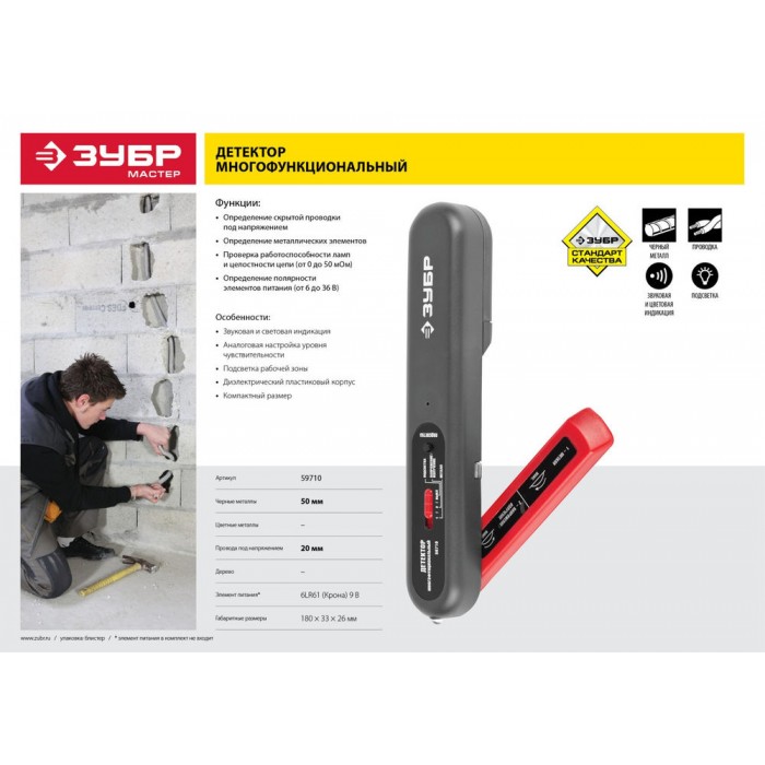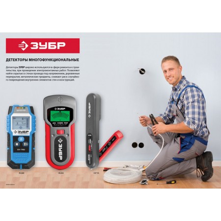 Тестер ЗУБР многофункциональный с детектором металла обладает повышенным ресурсом, обеспечивает высокое качество выполнения электромонтажных работ. Применение высококачественных материалов обеспечивает длительный срок службы. Детекторы незаменимы при проведении строительных, ремонтных и электромонтажных работ.