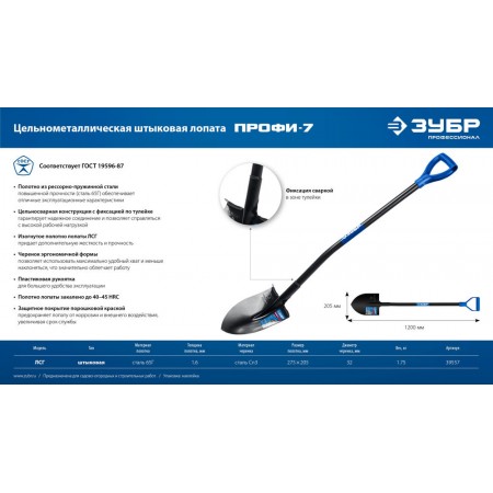 Штыковая лопата тип ЛСГ 275х205х1200мм полотно рессорная сталь 1.6мм закалено стальной изог.черенок с ручкой ПРОФЕССИОНАЛ ЗУБР ПРОФИ-7 39557